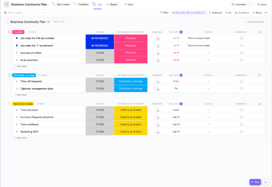 Create your business continuity plan (with free template) A business continuity plan could be your saving grace in the event of an emergency, so isn't it time you created one? Here's how you do it. Written by Stephanie Lennox Updated on 23 November 2022 Our experts We are a team of writers, experimenters and researchers providing you with the best advice with zero bias or partiality. Written and reviewed by: Stephanie Lennox Writer As a small business owner you may have been alarmed by the events and uncertainty of the past few years. Since COVID first hit, a barrage of tough trading conditions has seen countless businesses forced into administration or even company liquidation.With a background of Brexit, pandemics, lockdowns, the Great Resignation, an in-and-out-and-in-again recession, and other current stressors – you will need a clear plan in place to keep operations running smoothly in these uncertain times – one that focuses on the continuity, survival and durability of your small business. That's where a Business Continuity Plan can be essential.You may have heard about Business Continuity Plans (BCPs), but don't know exactly what they are or how to go about creating one. Whilst many small businesses have insurances in place, far less know they need a BCP or some kind of framework to deal with unexpected or unpredictable events.We’ll guide you through the process here, explaining the key considerations and elements. By the end of this article you’ll know how to write a thorough and workable BCP, using the free template provided to get started. In this article, we will cover: What is a Business Continuity Plan? Why is a Business Continuity Plan Important? How to Create A Business Continuity Plan Next Steps: Testing and Reviewing Your Plan Get started with Clickup's free business continuity plan template today Our below guide will give you detailed advice on how to write a quality BCP.But first, you need to know what to include – and that's where a high quality template can help.We recommend using the free clickup.com BCP template to ensure nothing gets missed. Every step involved in the business continuity plan – coordinating your emergency response, forming your strategy to get back up and running and communicating with your customers – is already mapped out for you, ready to be filled in with your details.We recommend creating an account with Clickup to use this free template – doing so means you may be able to keep your business protected financially and otherwise in the event of an emergency. You can see the template below, or click to try it for yourself by signing up to Clickup. What is a Business Continuity Plan?Business continuity is the ability of an organisation to continue production and delivery to an acceptable standard following a disruptive incident. A Business Continuity Plan details the steps and strategies to how you intend to do that.Your Business Continuity Plan can take many different forms – a paper document that you could store away in a filing cabinet, or a digital document that you store on your computer (or multiple if you want to be really safe).Ultimately it is the emergency strategy you use if you want to get your business on track in terms of regaining customers (and to avoid losing them to competitors) from supply chain issues, for example, to fixing physical damage to products or property, recovering from any losses of particularly significant people, and keeping the business from fully having to close down due to significant negative events.You would normally use it as soon as you possibly can after said negative events to mitigate as much damage (whether physical or representational) as you can. This would also inspire confidence about you to your team and show the leadership needed to deal with stressful situations when it’s most needed. Why is a Business Continuity Plan Important?The state of the world leaves much to be desired right now. We are seeing such unprecedented upheavals in almost every sector of everyday life – from the cost of living, to post-pandemic effects, to rising electricity prices and other forms of inflation – that Collins Dictionary chose “Permacrisis” as their 2022 word of the year.“Permacrisis” perfectly encapsulates the ‘survival mode’ most small business owners are in right now. But having a Business Continuity Plan ensures that your company and its assets are protected and are able to function quickly in the event of a disaster – so that the business survives with as little damage as possible (financial or otherwise).Your business continuity plan should detail such important aspects such as:Coordinating an emergency responseDealing with damaged infrastructureTimescales for getting systems back up and runningStrategies for reassuring customers How to Create a Business Continuity PlanWe know you already have a lot on your plate right now, and creating a new plan may seem like a lot of work with multiple considerations and factors – but not to worry. A solid plan is worth it, as it can be an essential asset for years to come, and we’re here to walk you through making one.(We’re also assuming you already have your business plan in place, but if not, we also have a guide that will give you detailed advice on how to write a quality business plan here.)Step 1: What are your potential risks and impact?Consider all the potential risks to your company. There are external risks (for example power cuts, natural disasters, cyber attacks and other things that are out of your control for the most part), and internal risks (for example sudden cash-flow issues, tough sales months or losing key staff).What parts of the business could they affect? The issues could affect anything from your premises, people, stock and equipment, operations and processes, to technology.What could the impact be? You could for example experience a loss of sales and income, increased expenses, decreased customer sati